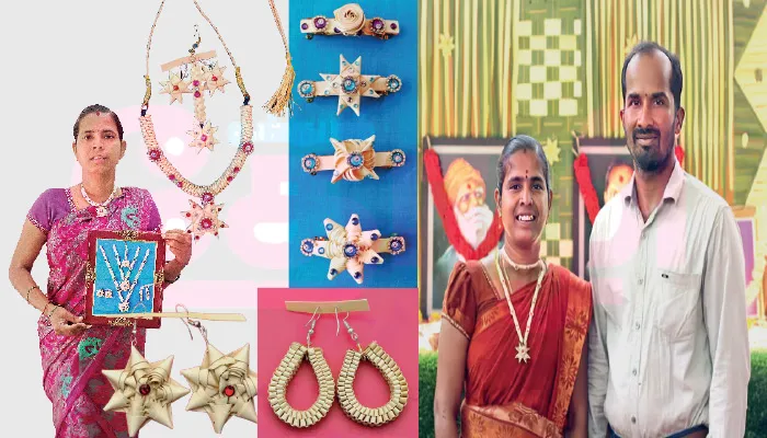 அந்த சமயத்தில்தான் பனை ஓலைகளில் பெண்களுக்கான நகைகளை வடிவமைக்க முடியும் என்று தெரிய வந்தது. அதற்கான பயிற்சியினை முறையாக எடுக்க ஆரம்பித்தேன். இப்போது கடந்த ஏழு வருடமாக பெண்களுக்கான நகைகளை பனை ஓலைகளில் வடிவமைத்து விற்பனை செய்து வருகிறேன்’’ என்றவரை தொடர்ந்தார் அவரின் கணவர் கார்த்திகேயன்.