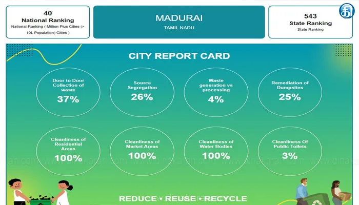 இந்தியா முழுவதும் 10 லட்சத்துக்கும் மேல் மக்கள்தொகை கொண்ட 40 நகரங்களின் பட்டியலில் மதுரை நகரம் கடைசி இடமான 40வது இடத்தைப் பெற்றுள்ளது. மதுரை நகரத்தைப் பொருத்தவரையில் வீட்டுக்கு வீடு குப்பைகள் சேகரிக்கப்படுவது 37%, குப்பை வகைப்பிரித்தல் 26%, உருவாக்கப்படும் குப்பைகளை மறுசுழற்சி செய்து கையாளும் திறன் வெறும் 4%, குப்பை மேடுகளை மறுசீரமைத்தல் 25% என்கிற அடிப்படையில் குறைவான மதிப்பெண்களைப் பெற்றுள்ளது.